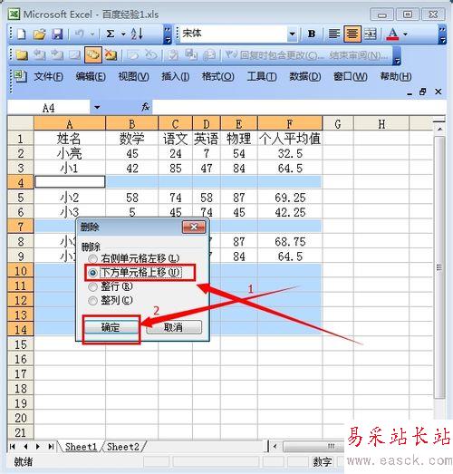 6、在刪除設置窗口里點擊“下方單元格上移” 然后點擊“確定” 如圖