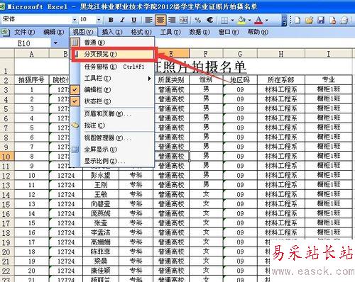 1、如圖所示我想將此表分三頁打印,每個班占據一頁紙,首先需要點擊“視圖”。