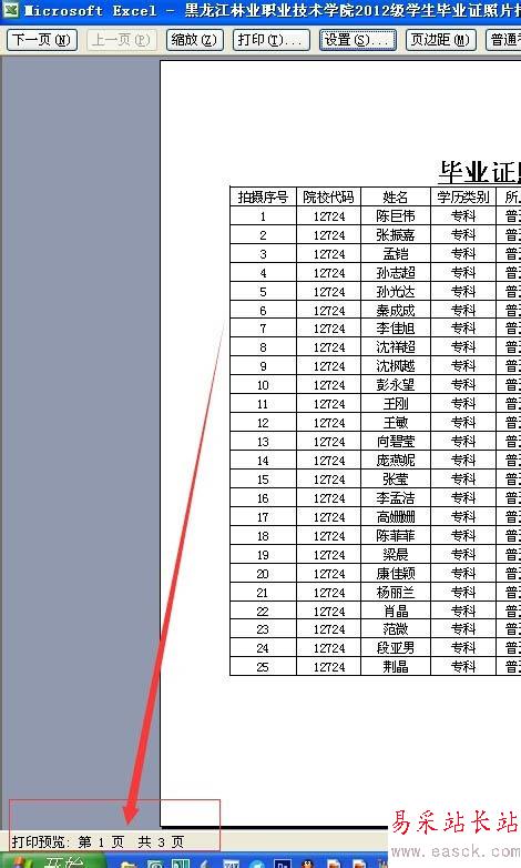 7、點擊預覽之后觀察箭頭所指位置,這個表格已經被分成三頁顯示了。