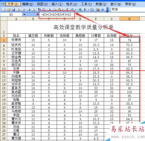 2、可以看到總成績那一列的數(shù)據(jù)使用公式生成的。