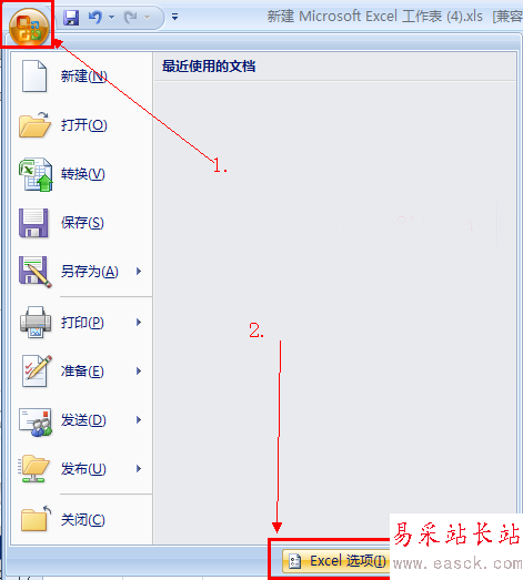 第2步:打開Excel2007之后,單擊左上角的Office按扭,在彈出的Office菜單中找到并單擊Excel選項。