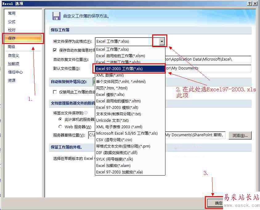 第3步:在打開的Excel選項窗口中,單擊左側【保存】,然后單擊右側【將文件保存為此格式】的下拉菜單,在下拉菜單中選擇【Excel 97-2003工作薄(*.xls)】,并單擊保存按扭。