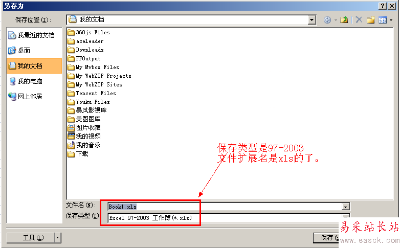 第6步:這時會彈出一個【另存為】的窗口,在這個窗口中,默認的保存類型是第三步所設置的【Excel97-2003工作薄(*.xls)】,文件的擴展名是.xls。