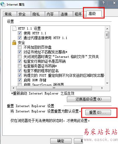 3. 點擊高級選項卡,點擊重置,勾選刪除個性化設置,點擊重置。
