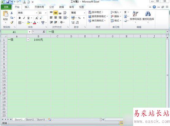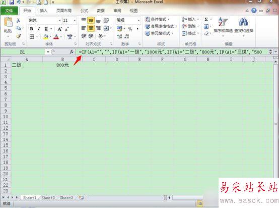 下面圖例是我要向大家展示的,下拉菜單的一個(gè)小功能“選擇一級時(shí),B1單元格會(huì)出現(xiàn)1000元,選擇二級時(shí),B1單元格會(huì)變成800元,為了實(shí)現(xiàn)這個(gè)功能,前提我們還要在B1單元格錄入工式。