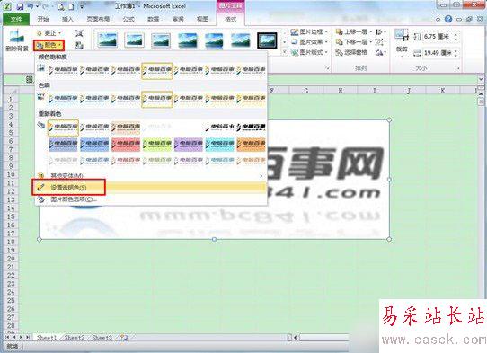 第二步:選中圖片,點擊“圖片工具”下的“顏色”選項,選取下方面“設(shè)置透明色”,如下圖: