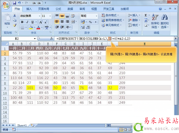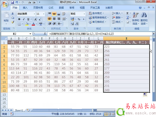 ①首先啟動excel2007,打開含有數據的表格,一年之中十二個月的數據情況,我們要隔2列進行求和,例如三、六、九、十二,說起求和,函數公式必不可少,我們不要怕這些,在M2單元格輸入下圖中的公式,進行隔2列求和。