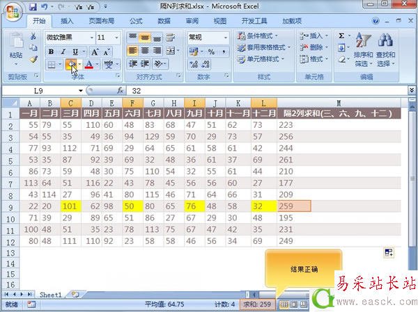 ③下面,我們來驗證一下函數公式計算的對不對,將第9行三、六、九、十二4個月份的數據以黃色顏色,按住Ctrl鍵選中,在下方的狀態欄中可以查看到求和結果為259,證明我們的公式計算準確無誤。