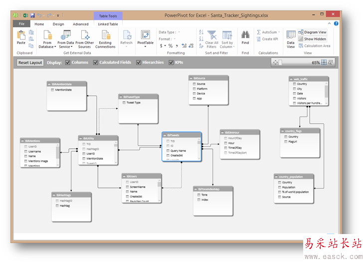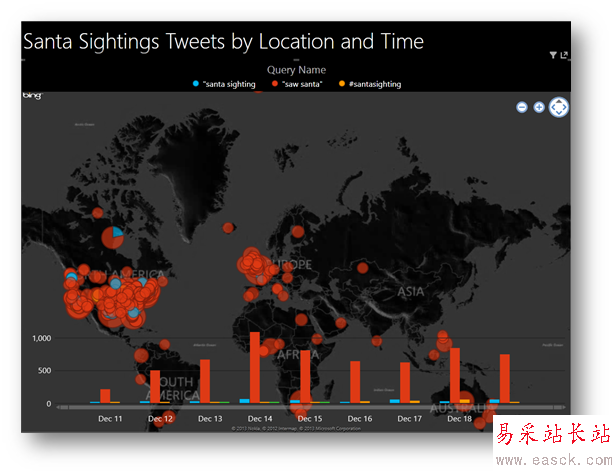 要回答這個問題,來自社交網絡的數據是最合適不過的了。于是Power BI團隊用以下關鍵字在推特上做了一些搜索:"santa sighting", "saw santa"以及"#santasighting",把這些搜索結果數據導入到Excel之后,創建Power Pivot模型,然后在Power View中的可視化效果來瀏覽推特中的數據,以及,這些數據都是來自于哪里。