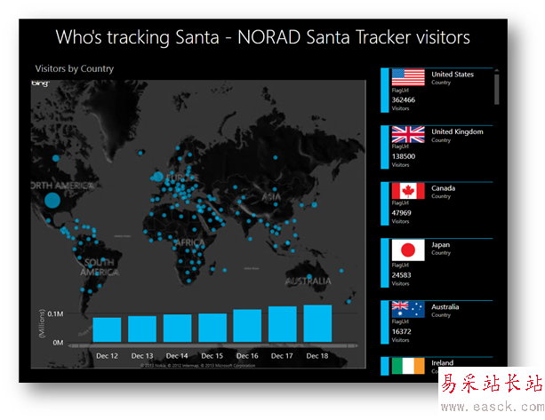 除此之外,Power BI團隊通過NORAD Santa Tracker網站的數據,在圣誕節前對全球范圍內的訪問者進行統計。首先通過Power Query的在線搜索,統計來自全球的站點訪問,導入到Excel中,然后創建數據模型,并且通過Power View的可視化功能顯示最近7天的訪問情況。