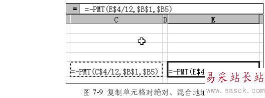 如果要使復(fù)制后公式的引用位置保持不變,應(yīng)該使用絕對(duì)地址引用或者混合地址引用。例如,在“c5”單元格中儲(chǔ)存有公式“=-PMT(C$4/12,$B$1,$B5)”,選定“C5”單元格,按下“復(fù)制”按鈕,再將鼠標(biāo)指針指向單元格“E5”,然后按下“粘貼”按鈕,就會(huì)看到單元格變成了“=-PMT(E$4/12,$B$1,$B5)”,如圖7-9所示。