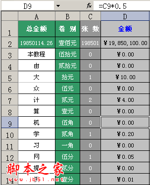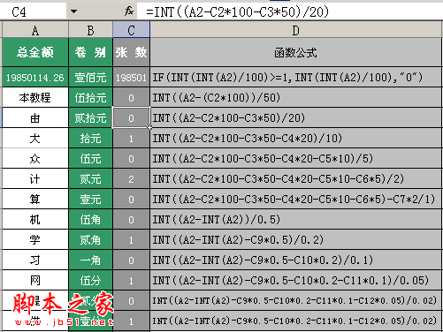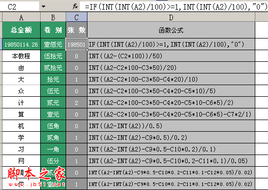 上表中,A2給出一個金額數,然后,在B列給出金額的不同幣種,C列算出各由多少張的壹佰元、伍拾元、貳拾元、拾元、伍元、貳元、壹元、伍角、貳角、一角、伍分、貳分、壹分組成。