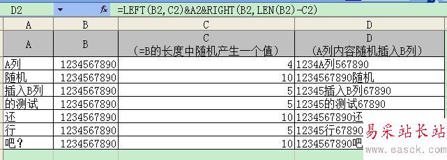 =LEFT(B列內容,B列隨機位置) & A列內容 & RIGHT(B列內容,LEN(B列內容)-B列隨機位置)