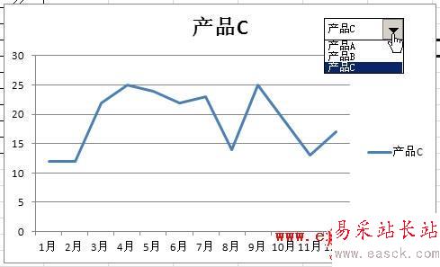 然后拖動填充柄,填充公式到G13單元格,在組合框中選擇某個系列,如“產品A”,G列就會顯示該系列的數據,如圖所示。