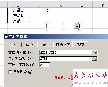 4、右擊組合框控件,在彈出的快捷菜單中選擇“設置控件格式”,彈出“設置對象格式”對話框,選擇“控制”選項卡,將“數據源區域”設置為“$I$1:$I$3”,將“單元格鏈接”設置為J1單元格,這樣在組合框中選擇某個系列名稱時,J1單元格中就會顯示相應的數字。