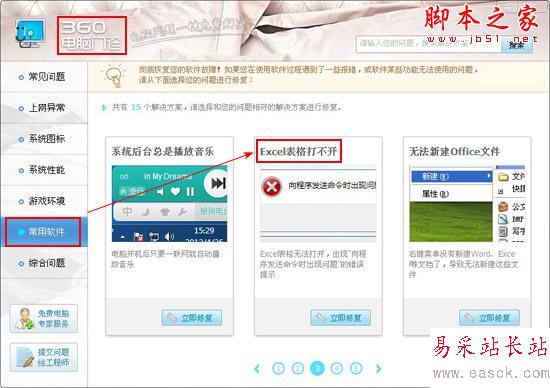 最后,經過上面的步驟,如果還沒有解決問題,那么我們還可以打開360安全衛士,在電腦門診里面,我們選擇常見軟件,然后就可以看見“Excel文件打不開”,我們打開按照解決就可以了。