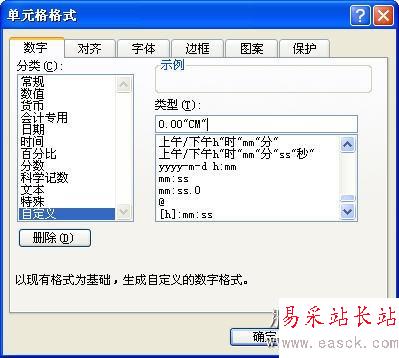 第二步:在打開的“單元格格式”對話框中,在“數字”標簽中,選中“自定義”項,在右側“類型(T):”下方的文本框中輸入“0.00"CM"”(如圖2,不含外側引號),最后單擊“確定”按鈕。
