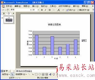 要將Excel中的圖表復(fù)制到PowerPoint中,首先要選中源文件中要復(fù)制的圖表,并對其進行復(fù)制。然后切換到PowerPoint窗口中,單擊“粘貼”按鈕,Excel中的圖表就被粘貼到了PowerPoint中。單擊PowerPoint中的圖表,對其大小和位置進行調(diào)整后,其結(jié)果如圖所示