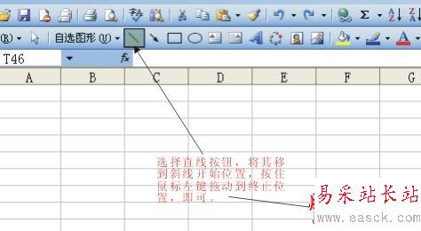 步驟2:調出繪圖工具后,選取 “ 直線 ” 。鼠標變成十字型.將其移至要添加斜線的開始位置,按住鼠標左鍵拖動至終止位置,釋放鼠標,excel表格添加斜線就畫好了。
