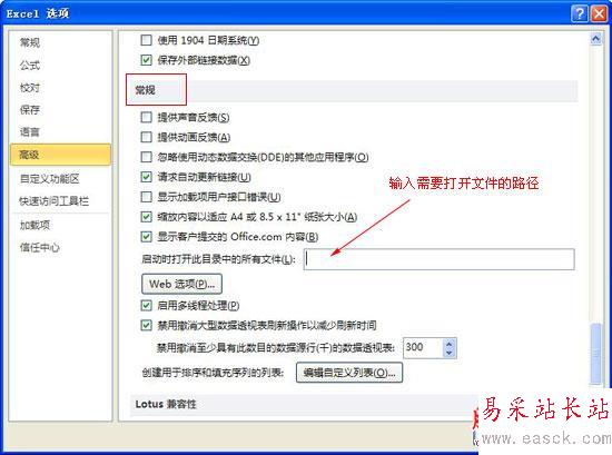 然后打開(kāi)“Excel選項(xiàng)”對(duì)話框,單擊“高級(jí)”選項(xiàng)卡,在其中的“常規(guī)”欄的“啟動(dòng)時(shí)打開(kāi)此目錄中的所有文件”文本框中輸入需要打開(kāi)文件的路徑,單擊“確定”按鈕,如圖所示: