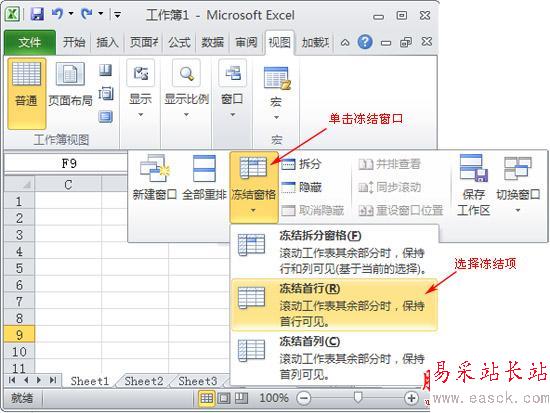 單擊“視圖”選項(xiàng)卡,在“窗口”組中單擊“凍結(jié)窗口”按鈕,在彈出的下拉列表中選擇所需的凍結(jié)方式即可,如圖所示。