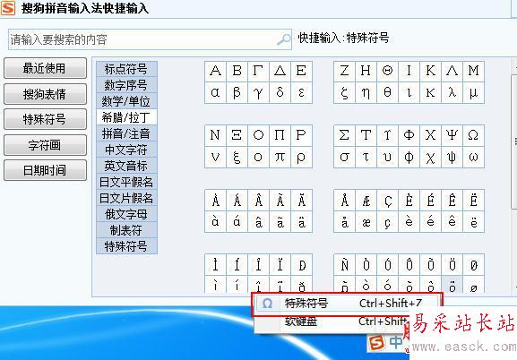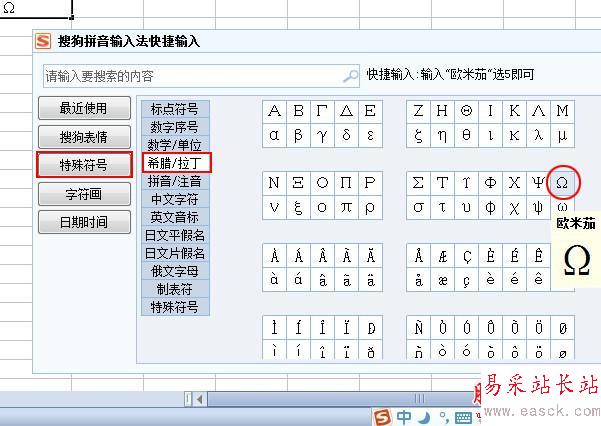 方法三,我們如果覺得嫌麻煩的話,就下載一個某些輸入法來歐姆符號怎么打,比如拼音加加、搜狗、QQ,前提就是你要先自定義好菜單才行。在這里筆者就用搜狗來舉例吧。畢竟用搜狗人還是不少的,筆者也是用搜狗的,嘿嘿。當然,首先我想要下載搜狗輸入法,直接去百度下載即可,很快的。安裝完成后就可以用了。我們可以把輸入法切換到【搜狗拼音輸入法】,在上面打oumu, 或者oumijia,這樣歐姆符號就直接打出來了。如圖所示。我們也可以把切換到【搜狗拼音輸入法】,出現了一個圖標小窗口,然后在點擊窗口中的【軟鍵盤】按鈕,再選擇【特殊符號】選項,及彈出如下圖所示的窗口,然后我們在選擇【特殊符號】-【希娜/拉丁】上面找到歐姆符號Ω。這樣操作就完成了。