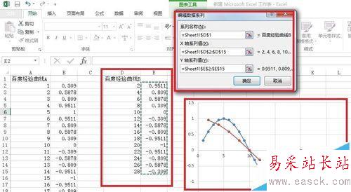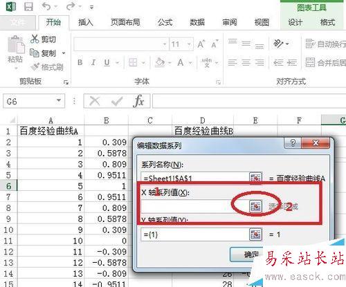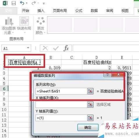 6、同上,在選擇數據源的對話框,點擊添加“百度經驗曲線B”的系列名稱,x軸系列值和y軸系列值。如下圖。圖中已經出現了兩條曲線。