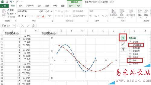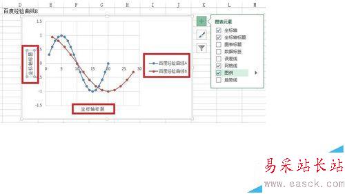 7、選擇圖右側的“+”號,可以增加坐標軸標題和圖例等,如下圖。可以修改坐標軸標題等。選中“圖例(百度曲線A和百度曲線B)”后,可以右鍵選擇“字體”,對圖例的字體進行修改。x軸和y軸的坐標題同樣也可這樣修改字體等。