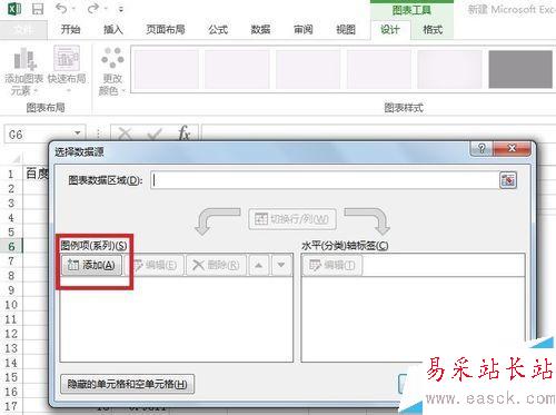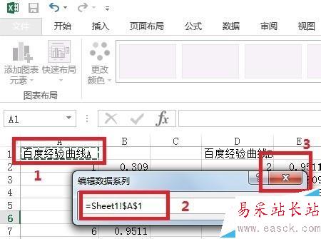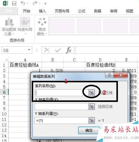 3、在空的圖上 右鍵-選擇數據-出現選擇數據源的對話框,點擊添加-出現數據系列的對話框-選擇系列名稱中的選擇區域(紅色數字2表示)--點選“百度曲線A”這個名字。然后點關閉重新回到編輯數據系列對話框。