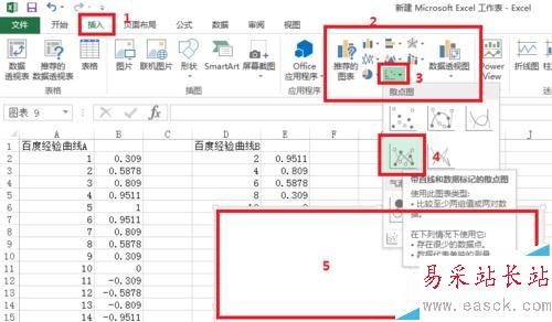 2、按照下圖中的順序依次操作:插入(紅色數字1)-圖表(紅色數字2)-散點圖的選項卡(紅色數字3)-紅色數字4標識的地方-紅色數字5(一個空的圖)。