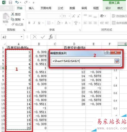 4、按照同樣的方式,編輯x軸的系列值。點擊紅色數字2的區域后,按住鼠標左鍵拉選紅色數字1區域的數字,出現后紅數2區域的‘編輯數據系列圖’。