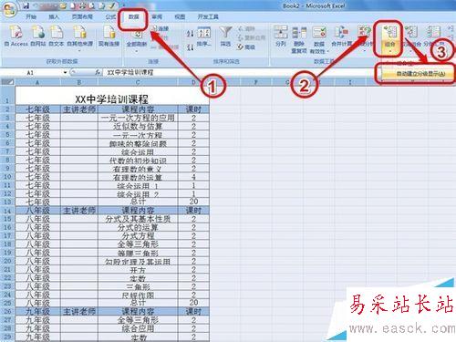 7、這算很快捷了吧?不,還有更快捷的設置方法。由于這個表格中有sum求和公式(每個年級后的“總計”這一行內有公式),所以還可以這樣來操作:執行“數據“——“ 組合“——“ 自動創建分級顯示“,也會出現相同的效果。
