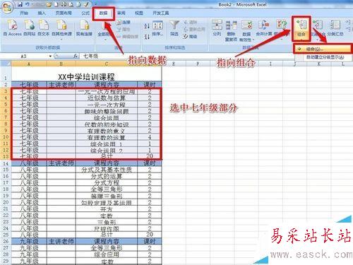 2、將七年級部分選中,依次執行“數據”——“組合”——“組合”。