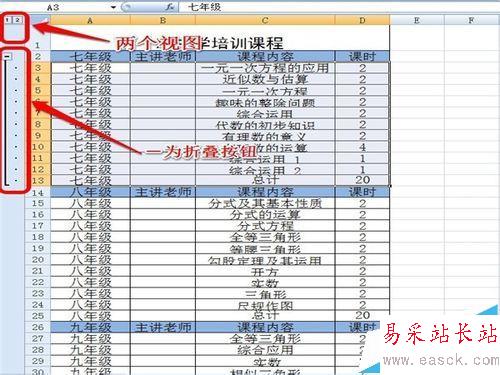 4、這時你會看到在表格的左側出現了1、2兩個視圖。點擊1可以將七年級部分折疊起來。點擊2,可以看到全部內容。而且在七年級內容的左側還出現了折疊按鈕,也可以將七年級部分折疊起來。