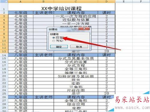 3、在彈出的“創建組”的對話框中將“行”選中,并確定。