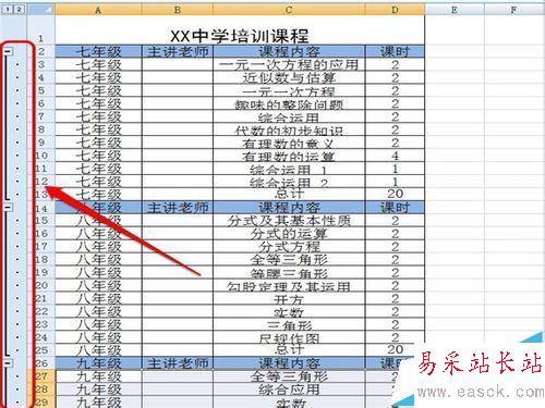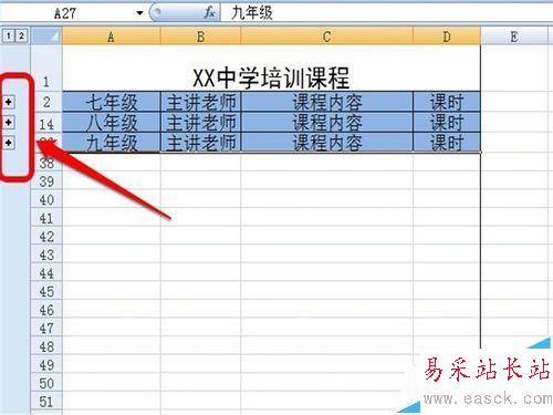 1、打開一個表格,我們看到里面有七、八、九三個年級的培訓課程。如果我們每次只想看到一個年級的培訓課程,怎么設置呢?