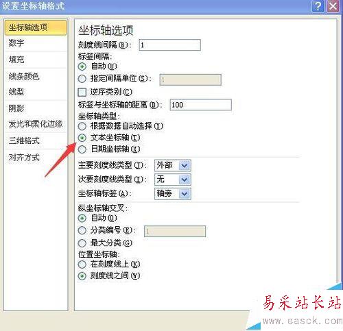 3、雙擊水平軸,坐標軸類型選“文本坐標軸”,確定后效果如圖