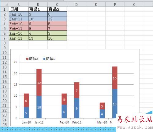 如圖,商品1和商品2進行兩年度的銷售量同比,用下圖中的堆積圖來表現就要清楚很多。