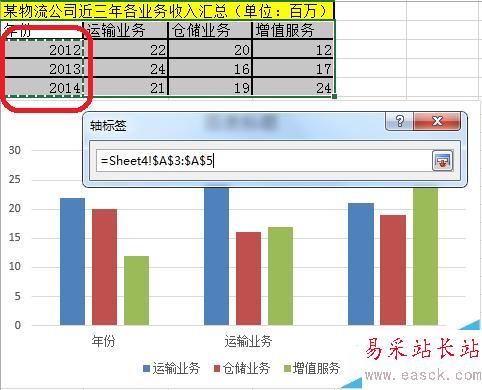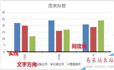 1、如圖所示,要以年份為橫坐標(biāo)的名稱,運(yùn)輸業(yè)務(wù),倉(cāng)儲(chǔ)業(yè)務(wù),增值業(yè)務(wù)為圖例。點(diǎn)擊圖表工具——設(shè)計(jì)——選擇數(shù)據(jù)。進(jìn)行圖例項(xiàng)(系列)編輯——水平(分類)軸標(biāo)簽編輯。