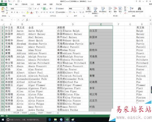 6、去除篩選功能,并將列寬恢復(fù)正常寬度,再次使用兩端對齊填充,恢復(fù)中文姓名的完整。