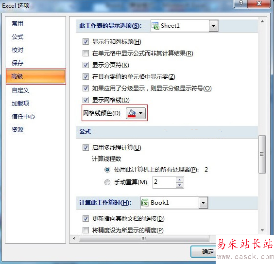 2、在“Excel選項(xiàng)”→“高級(jí)”中找到“此工作表的顯示選項(xiàng)”下面的“網(wǎng)格線顏色”,選擇自己喜歡的顏色,確定即可。