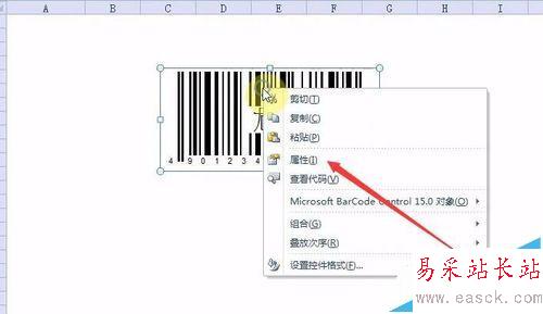 7、這是會出現一個系統默認的條形碼,我們將條形碼選中,點擊鼠標右鍵,選擇“屬性”,如圖: