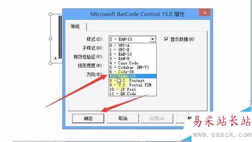 8、在Microsoft BarCode Control 15.0屬性窗口里面選擇一個條形碼樣式,并點擊確認,如圖: