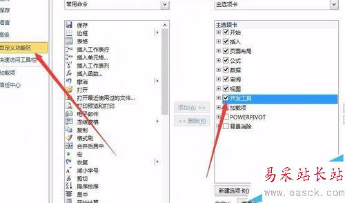 3、進入以后繼續選擇“自定義功能區”,在旁邊有小勾的文本框里將“開發工具”前畫上小勾,并點擊確認,如圖: