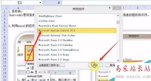 6、在“其他控件”的窗口里選擇開發工具Microsoft BarCode Control 15.0,這里您的電腦上可能是Microsoft BarCode Control 14.0,總之選擇最新版本即可,并點擊確認,如圖: