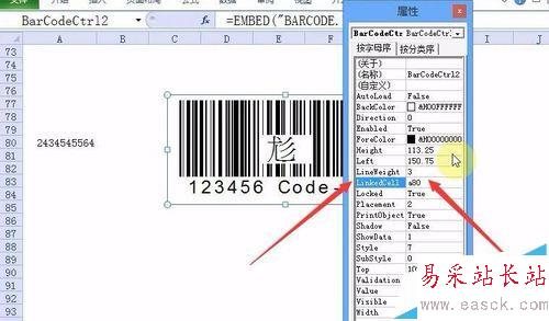 9、我們需要將條形碼下方的數值改成我們自己的內容,這時可以在空白處先輸入我們的數值,再用鼠標選擇條形碼,點擊鼠標右鍵,打開屬性,在列表中找到“LinkedCell”,然后在后面的空白格里輸入剛剛輸好的數值的行列號即可,如圖: