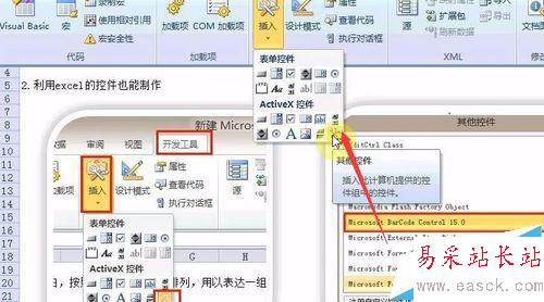 4、在Excel的工具欄里就可以看到多了一個“開發工具”,這時打開“開發工具”,選擇“插入”,如圖: