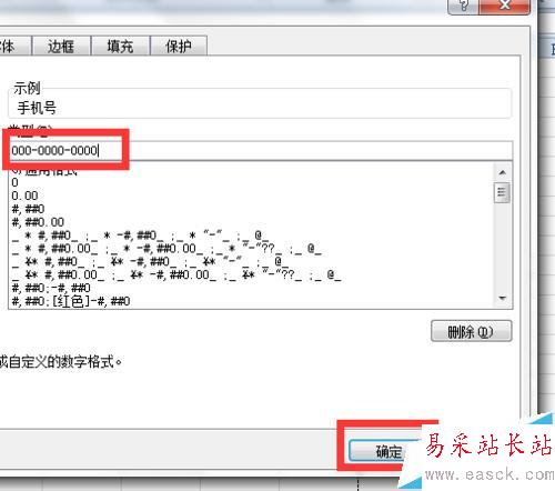 3、我們在“數字”界面單擊下選中【自定義】,然后我們在“類型”里面輸入000-0000-0000的格式內容,就是我們手機號碼的11位數字顯示格式。輸入完成我們就點擊【確定】就可以了,我們看看下面圖示的效果吧~