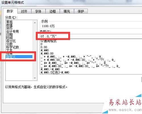 2、接著,我們還是選擇“自定義”數字模式,在右側的類型里面輸入0!.0,"萬"(拼音輸入狀態),點下【確定】之后我們就可以看到效果啦~