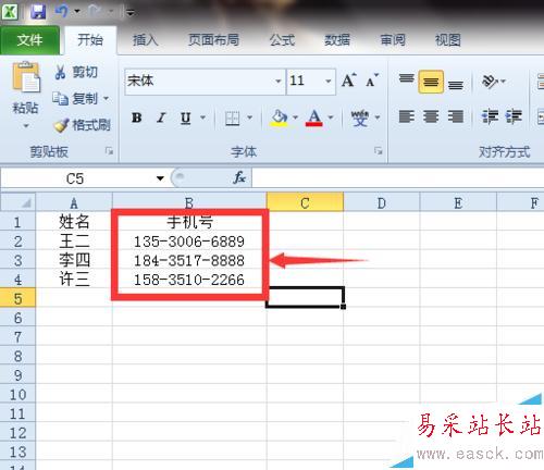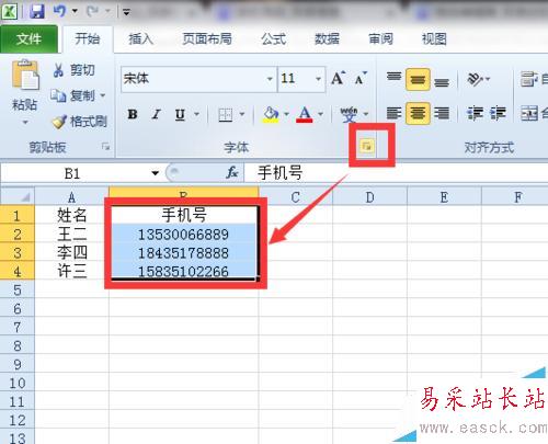 1、我們打開Excel輸入姓名和手機號碼(這里演示的是虛假的),再全部選中手機號碼的部分,我這里是“B1—B4”區域。然后,我們在“開始”菜單的“字體”選項卡里點右下角的三角箭頭,就可以打開單元格格式的界面。
